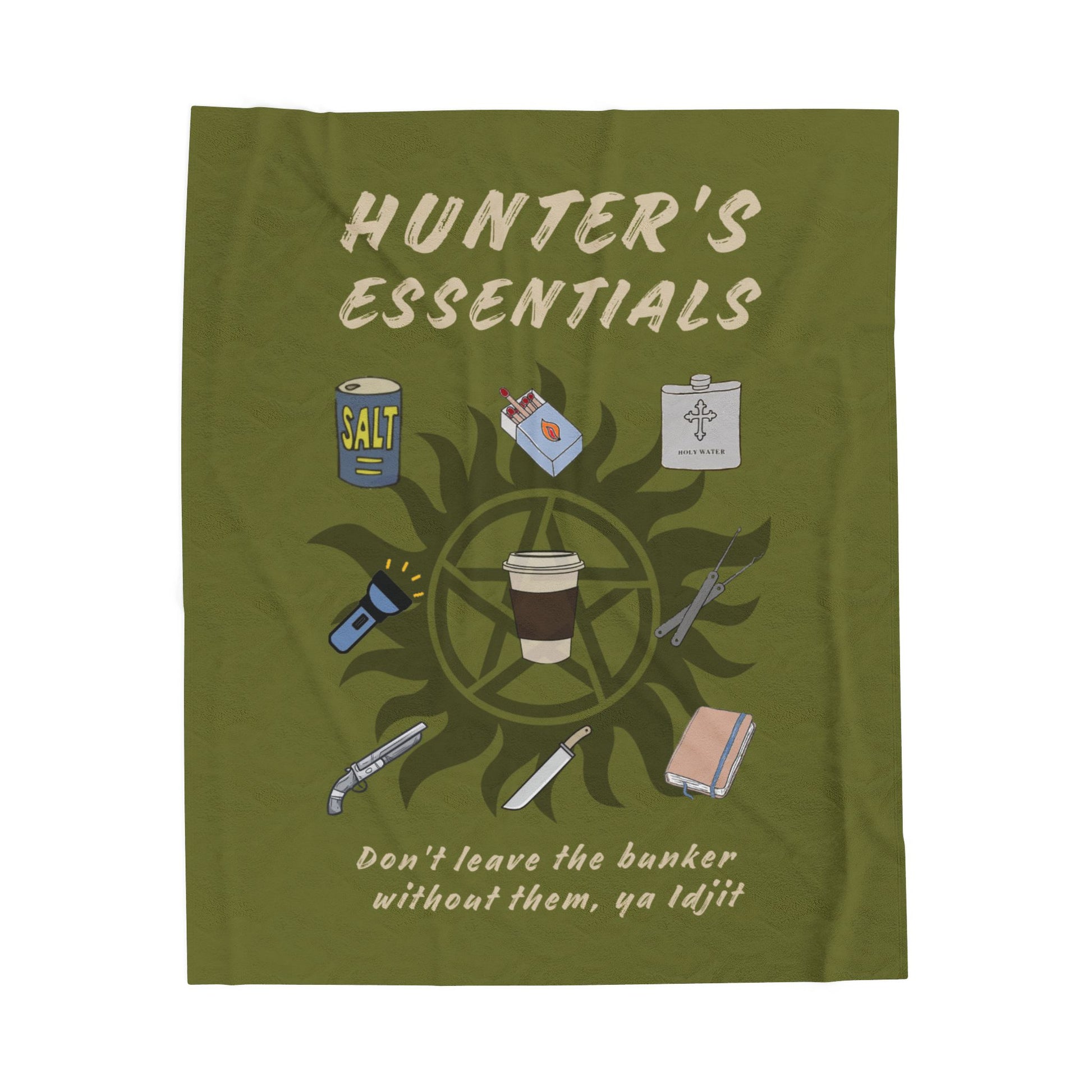 Hunter's Essentials Plush Velveteen Blanket - Supernatural Fan Design | Cozy Throw | Olive Green Fandom Blanket